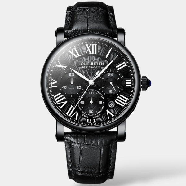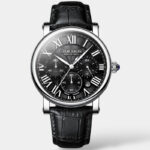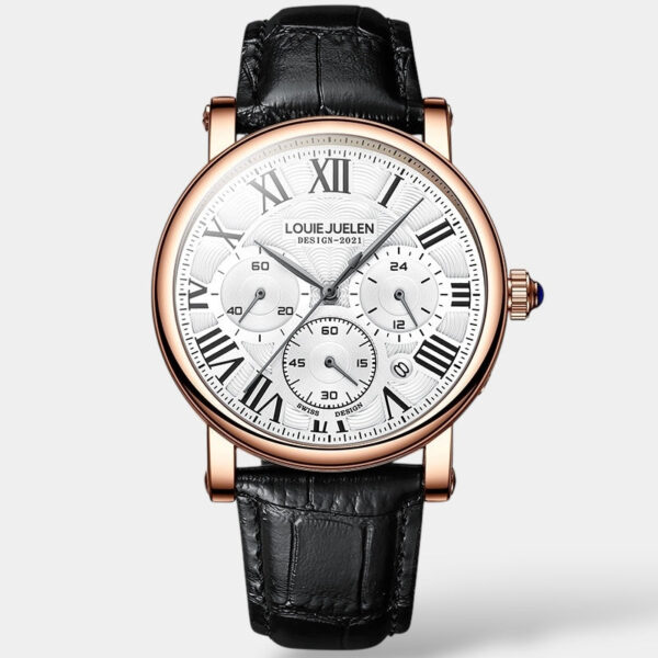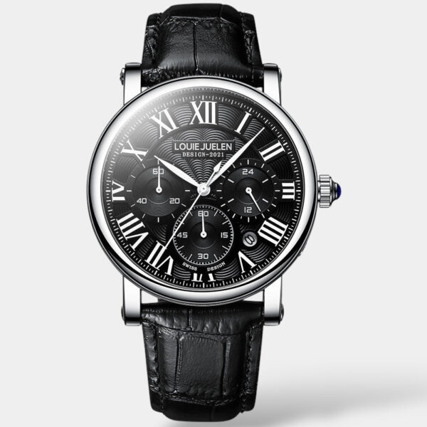 Un omaggio all’eleganza senza tempo e alla precisione tecnica. Il quadrante con numeri romani, tre cronografi funzionali e un movimento preciso esprime raffinatezza classica — senza eccessi.